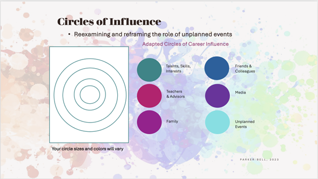 Additionally, Pryor and Bright (2003, 2011) encouraged participants to creatively reflect on the role of unplanned events on their career related decisions. In their “Circles of Influence” exercise, they asked participants to represent career decision-making influences as concentric circles, varying the size of each circle to represent the scale of each influence. Categories of influences included: talents, interests, and skills; teachers and advisors; family; friends and family; media; and unplanned events. Upon review and reflection, participants were often surprised about the impact of unplanned events and were motivated to reevaluate unplanned events as important opportunities. Figure 1 shows an adapted Circles of Influence prompt (Parker-Bell & Osborn, 2023). With this adaptation, participants are encouraged to represent each influence with both size and color, adding another layer of association for discussion.